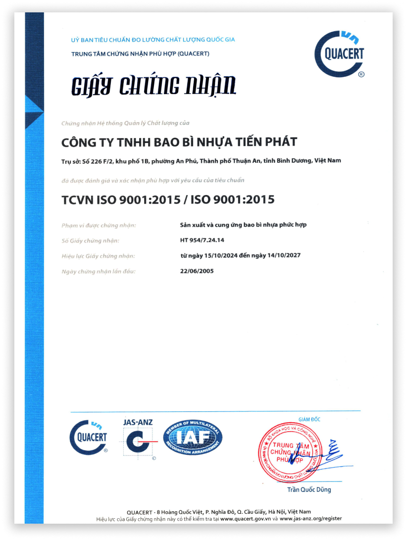 Certified by Bureau Veritas under ISO 9001 standards since 2012, Tiến Phát has consistently strived to improve its production processes to meet the specific requirements of customers in the flexible packaging industry. Implementing a quality management system within an organization involves establishing documented processes that align with ISO 9001 standards. In line with our commitment to compliance with regulations and standards, Tiến Phát follows a methodical approach to ensure the quality of our packaging materials.
